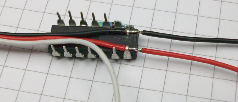 Die restlichen Beinchen werden gestutzt. Die weissen Drähte werden nach dem Schaltbild angelötet, und eine